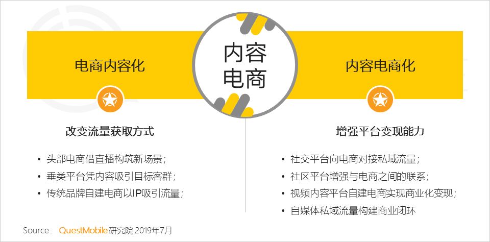 1、现阶段内容电商的发展分为两种方向,一种是电商平台构建内容,改变了原本的流量获取方式,另一种是内容平台的电商化,通过向电商平台导流、或是自建电商,实现平台商业变现