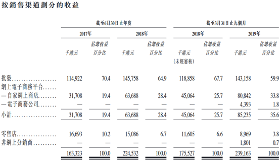 根据弗若斯特沙利文报告,按2018年的收益计,公司为香港第五大的彩妆分销商,占香港彩妆分销市场约4.0%。截至2017年及2018年6月30日止年度及2019年3月31日止九个月,来自公司批发客户所产生的收益分别占/总收益约70.4%、64.9%及59.9%。