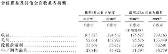 截至2017财年及2018财年,公司实现营收分别为1.63亿港元及2.25亿港元,同期毛利分别为9266.1万港元及1.38亿港元;毛利率分别为56.735%及61.43%。