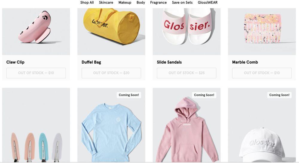 今年7月17日,Glossier带着自己标志性的粉色跨界时尚界,在Instagram推出了“GlossiWEAR”服饰系列,包括连帽卫衣、T恤、棒球帽、拖鞋、发夹、运动包等,每件单品都露出着大大的“Glossier”的标志。