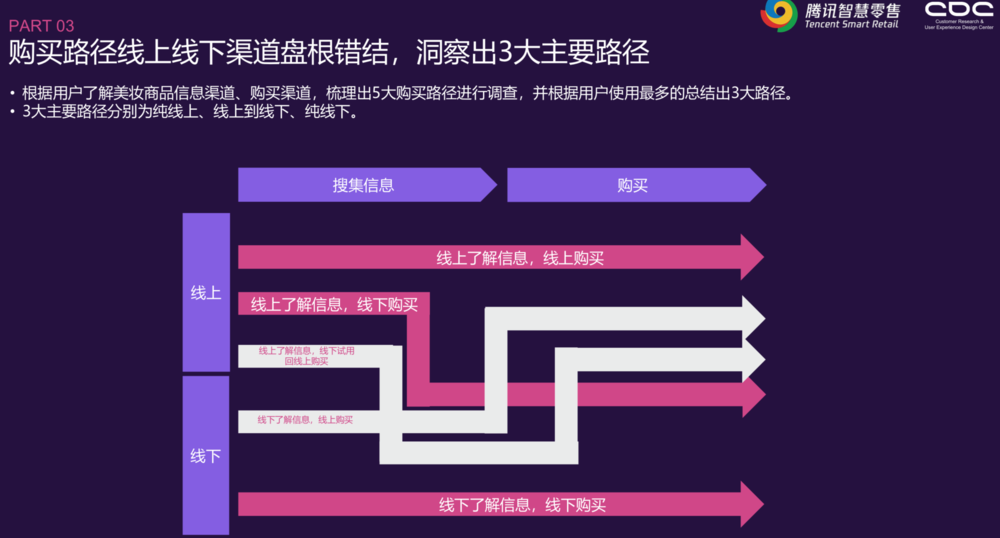 腾讯研究院有资料显示:消费者购买美妆产品的渠道很难单纯的被分为线上线下,有很大一部分都是线上线下交织。比如除了单纯的线上线下,还有这样几种:线上了解信息,但选择线下直接购买;线上了解信息,线下体验,但选择回到线上购买,还有线下了解信息,最后通过线上购买。