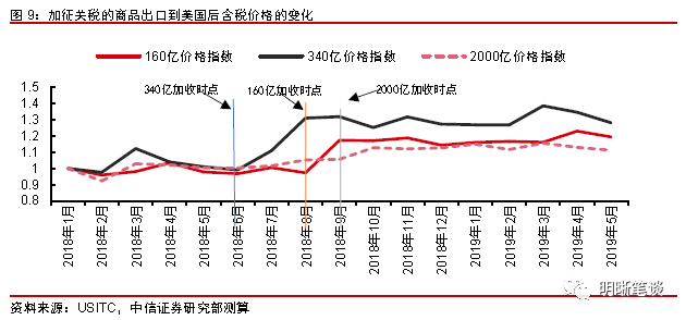 基于美国USITC公布的中国商品到岸价格、关税的费用以及各个商品的数量,结合之前加收关税的清单,以2018年1月的价格作为基数,计算出了160亿、340亿、2000亿美元商品的价格指数,价格单位为美元。可以看到关税加收时点后,美国所接受的含税价格均出现了较大幅度的上涨,对于关税清单的160亿美元以及关税清单的2000亿美元商品,加收关税后其价格的上涨幅度是低于关税的加收幅度的。而340亿美元商品价格上升幅度则较大,这可能与商品结构有关,可能是340亿美元商品利润较薄,也可能是国家对这部分清单退税力度不大所导致的。