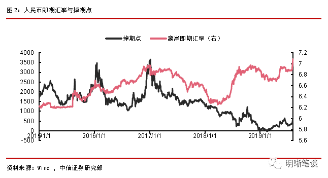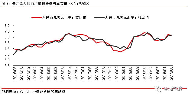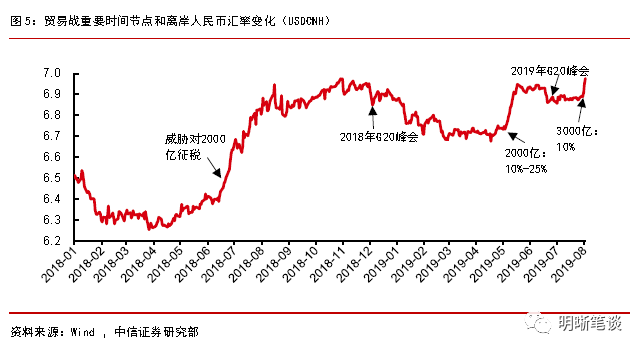 中美贸易摩擦和谈判的进程对人民币汇率的走势有重要影响,这从风险情绪和经济影响上共同作用,符合市场化作用的特点。而且,实际上在特朗普宣布对3000亿美元的中国出口商品加征关税之际,人民币汇率已经处在接近6.9的位置,实际上距离7已经非常近了,贸易摩擦的升级导致人民币对美元汇率进一步贬值并跨过7的水平。