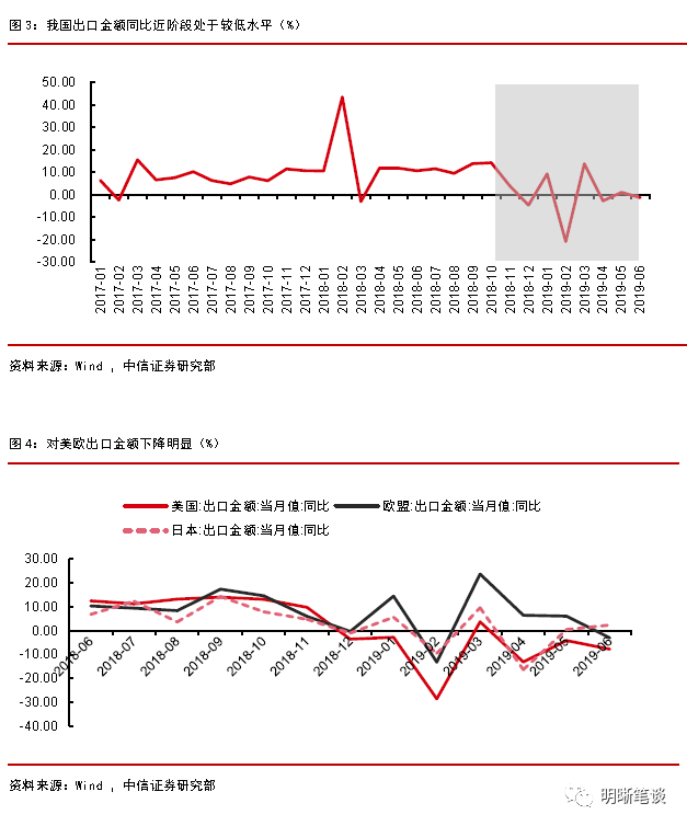 近期美国经济,就业改善,通胀走弱,零售好转;GDP增速消费分项改善,但受出口和投资分项的拖累,依旧弱于前值和预期;同时制造业指标的再创新低暗示了美国经济的疲弱态势持续性是较强的。就业方面,6月份美国非农就业数据总体和分项均有改善,薪资数据依旧不理想。通胀数据继续低于2%的目标,PCE与CPI数据基本符合预期,而PPI同比处于17年末以来的较低水平。美国6月零售数据好于预期,新屋开工和销售数据略低于预期,居民储蓄意愿较上月维持稳定且处于年内最低水平。GDP方面,美国第二季度GDP环比增速2.1%,弱于预期和前值,私人消费起到较大拉动作用,受贸易摩擦影响出口分项走弱,同时投资分项较上月边际走弱。另外,美国两项制造业数据持续走弱并创下新低,反映美国经济疲弱态势或将持续:7月Markit制造业PMI与6月ISM制造业PMI均再创新低。