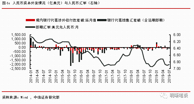 汇率的变动是出口的结果。当对美国出口的增加时,获得的美元兑换成人民币将增加人民币的需求,推动人民币的升值的压力;反过来对美出口下降也会导致人民币兑美元的贬值。综合来看当前我国正承受着较大的出口压力,而对外贸易的出口方面直接对人民币需求造成影响,在出口承压的情况下,对于人民币的需求也相应降低,持续面临的出口压力或为人民币汇率贬值的重要诱因。实际上在特朗普宣布对3000亿美元的中国出口商品加征关税之际,人民币汇率已经处在接近6.9的位置,实际上距离7已经非常近了,贸易摩擦的升级导致人民币对美元汇率进一步贬值并跨过7的水平。