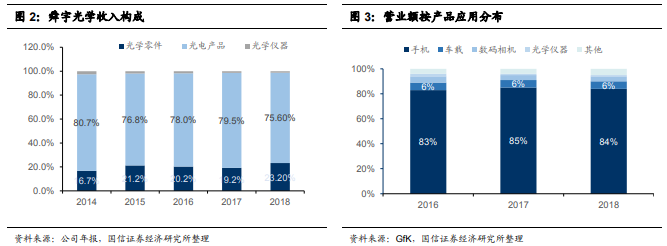 近几年,公司收入结构稳定,光电产品、光学零件保持约8:2的比例。2018年公司收入构成为:光电产品贡献75.6%,光学零件贡献23.2%收入,光学仪器1.2%。公司产品主要应用于手机、汽车、相机等消费电子领域。