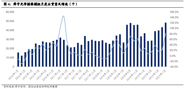 2019H1营收增长主要是因为智能手机业务、车载成像及传感相关业务带动。光学零件收入增长42.1%,光电产品增长27.1%,光学仪器下降8.6%。