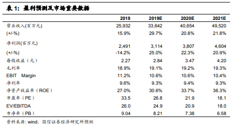 预计2019~2021年公司收入分别为336.4亿元/406.5亿元/495.2亿元,增速分别为29.7%/20.8%/21.8%,2019~2021年利润分别为31.1亿元/38.1亿元/46亿元,增速为25%/22.3%/20.9%。