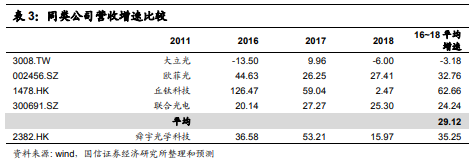 选取与公司业务相近的摄像模组和光学镜头行业A股、港股、台股公司做比较,采用PE法估值。