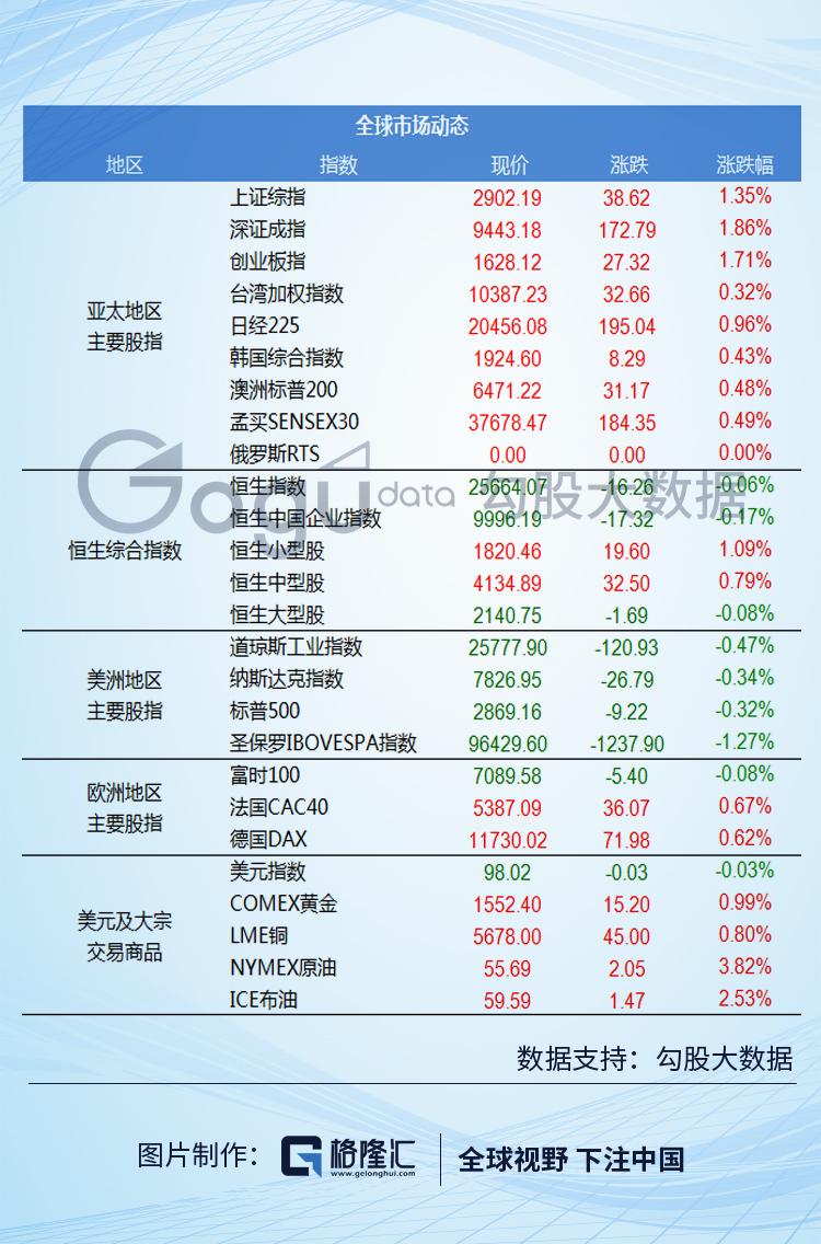【A股】 周二两市主要股指收跌,沪指跌1.16%,报2863.57点;深成指跌0.98%,报9270.39点;创业板跌0.1%,报1600.8点;北上资金净流出26亿。行业板块方面,保险板块跌幅最大,中国太保跌3%;酿酒、电信运营、多元金融、电器仪表等板块大跌靠前。黄金概念板块涨幅居前,银泰资源涨逾7%;维生素、抗癌、人造肉、免疫治疗、仿制药等概念板块相对活跃。