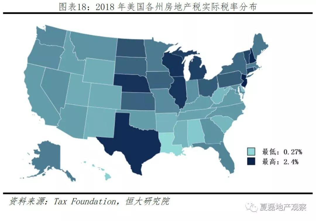 美国“以支定收”确定名义税率。美国房地产税率与地方政府财政预算收入和支出紧密相关。税率确定程序为,地方政府制定每个年度的财政预算支出和收入,扣除房地产税以外的其他收入后,确定所需房地产税收入,再根据区域内的房地产评估总价值和评估率,确定本年度的名义税率。如果税率有所变化,须经本地居民投票通过后才能执行。通常,房地产税率不会每年都发生变化,居民的税负较为稳定。2018年,各州的房地产税实际税率(以税额占评估价值比例衡量)介于0.27-2.4%。