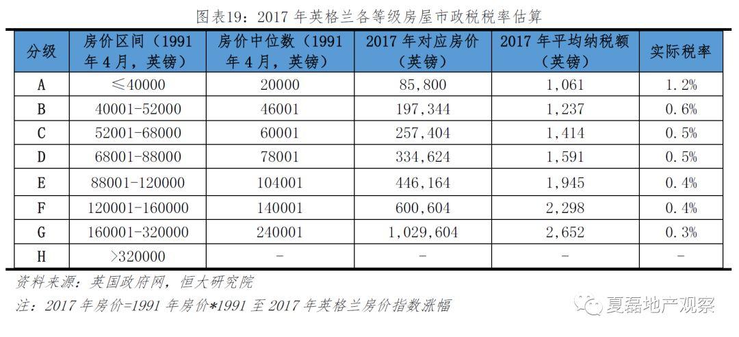 英国住房保有环节征收市政税,税基由评估机构评估房屋价值,分为八或九个等级。市政税以评估价值征收,税基由各地方自行确定。英格兰、苏格兰与北爱尔兰将每个住宅在1991年4月1日的房屋价值分为A-H八个等级,威尔士按照2003年的房屋价值分为A-I九个等级,后续建成房屋按照这两个基期的价格进行分类。英国房屋以A-D级为主,2018年,英格兰与威尔士A-I等级房屋分别占比24%、20%、22%、15%、10%、5%、4%、1%与0%。税率以D级住宅为基准,实行定额税收,税额累进。对A-H(或I)每个等级实行定额税收,D级为基准税基,其他等级的纳税额等于D级住宅纳税额乘以相应的税收乘数,房价越高,税收乘数相应增高。