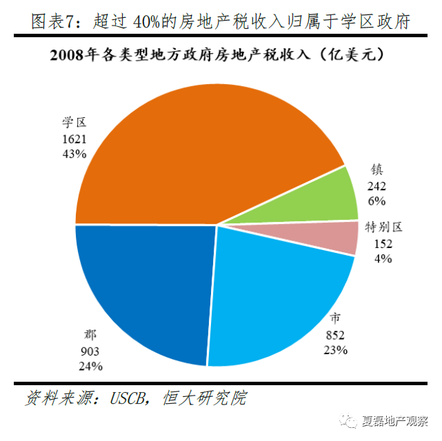 美国房地产税通常由郡政府统一征收,然后划转到相应的政府部门。房地产税收入对应支出于当地的公共服务,包括教育、医疗卫生、公共安全、道路交通等项目,超过50%的房地产税支出用于教育。地方政府的房地产税收入,超过40%归属于学区政府,各有20%归属于郡政府和市政府,其余少量归属镇政府和特别区政府。学区政府96%的收入来自于房地产税,而96%的总支出用于教育;郡政府45%的收入来自于房地产税,总支出中医疗卫生、教育、公共安全的占比达1/3;市政府40%的收入来自于房地产税,总支出中公共安全和教育的占比达1/4。