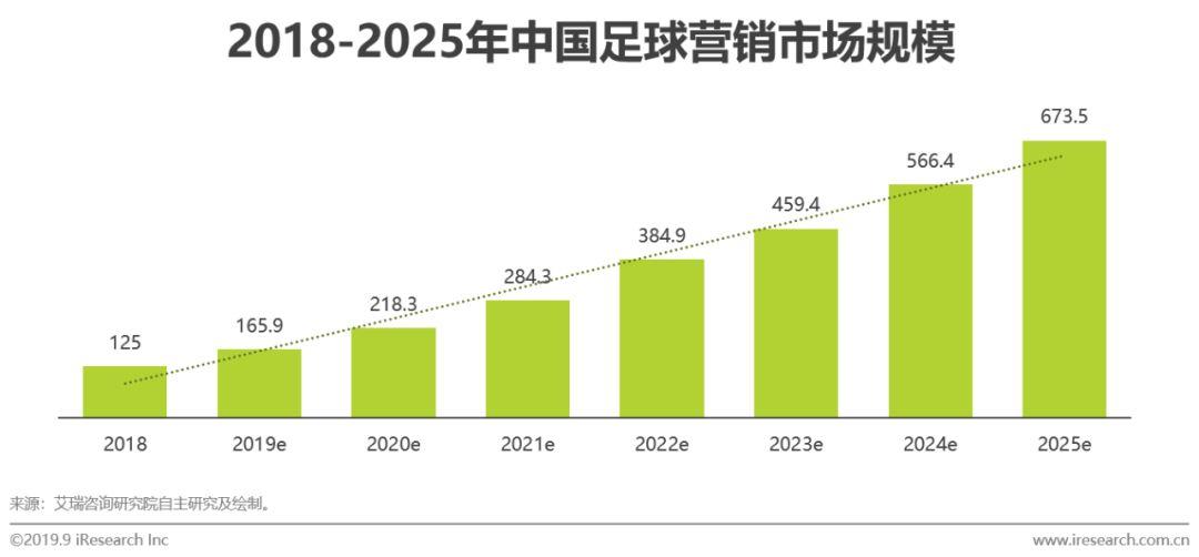 中国总体球迷规模接近2亿人,虽然中国足球营销才刚刚起步,但发展潜力巨大。预计未来数年的年均复合增长率将超过25%,到2025年,市场规模将达到673.5亿元。