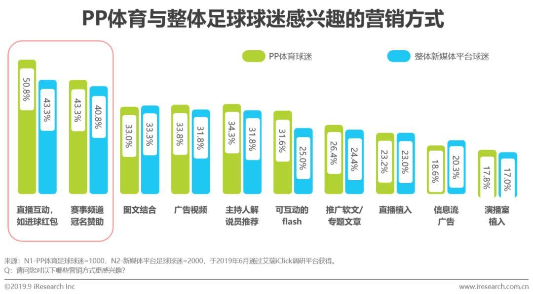在营销方式上,新媒体平台足球球迷的表现大体趋同。其中进球红包等直播互动类营销以及赛事频道冠名赞助受欢迎程度最高。