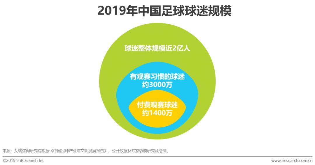 “世界第一运动”在中国有着广泛的群众基础,中国总体球迷规模接近2亿人,其中有定期观看足球联赛习惯的球迷数量约在3000万左右。清华大学发布的《中国足球产业发展报告》显示,中国付费观赛人群已经超过了1400万。预计到2020年,中国付费观赛人数将超过2500万人。在中国人均收入水平持续提升、人民消费意愿及消费习惯不断进化、中国互联网经济异常发达的背景下,足球营销在中国有着极为优秀的受众群体和发展空间。