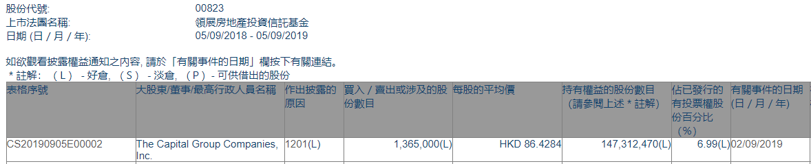根据港交所最新权益披露资料显示,2019年9月2日, 领展房产基金(00823.HK)遭The Capital Group Companies, Inc.以每股均价86.4284港元,减持136.5万股,总价约1.18亿港元。