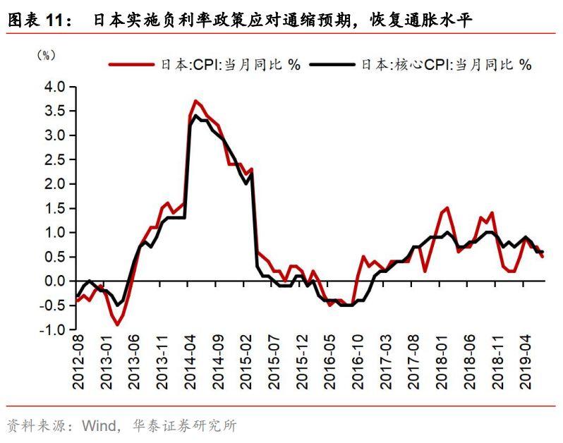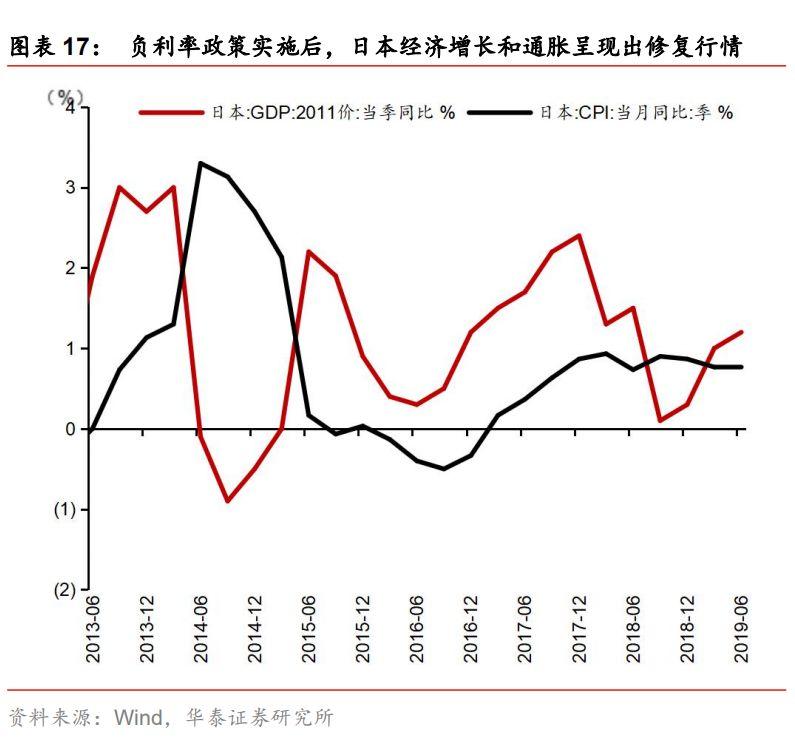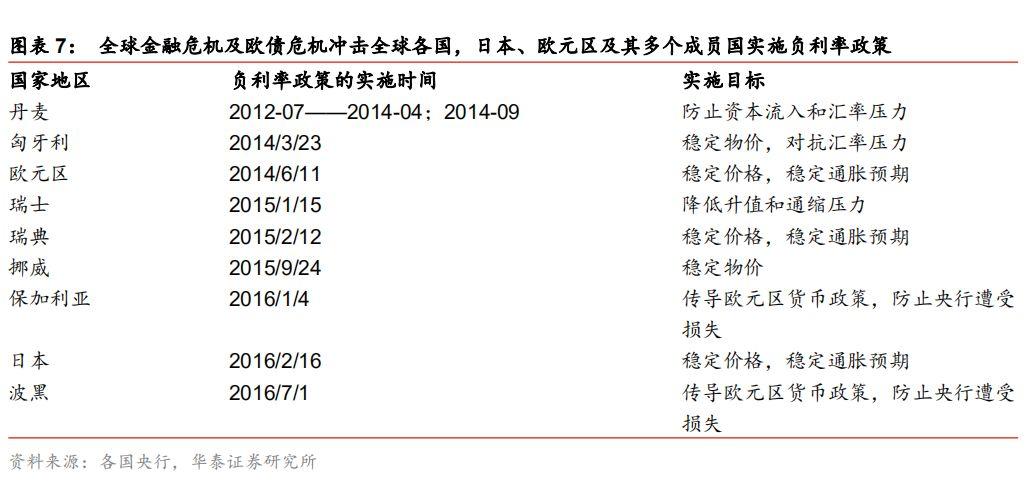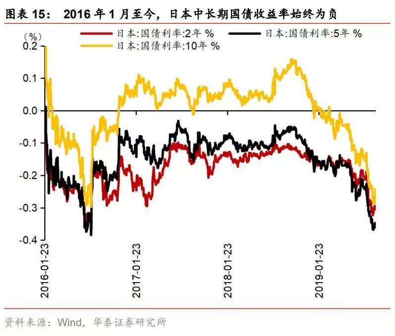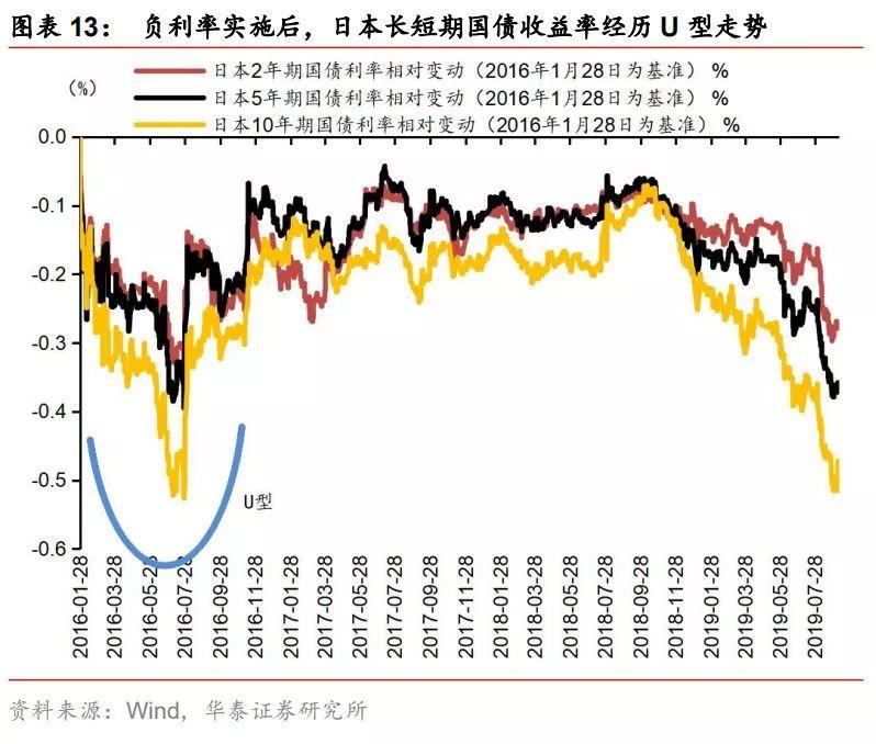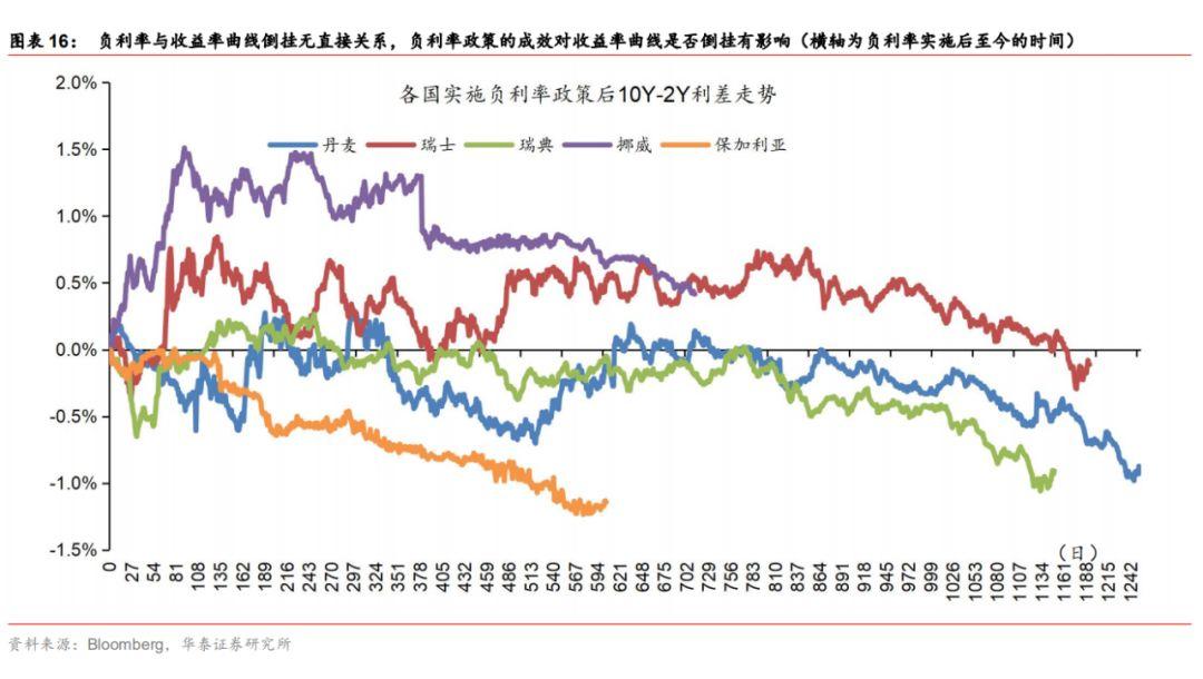 负利率与收益率曲线倒挂无直接关系,负利率政策的成效对收益率曲线是否倒挂有影响。根据欧元区各国负利率政策实施后的表现来看,利率曲线短期走势呈现为陡峭化,中长期10y-2y长短端利差收窄。我们认为,利率曲线实质上反映是市场及基本面现状,传统货币政策对短期利率影响较大,长期利率取决于市场预期以及经济增长、通胀和通胀预期等基本面表现,收益率曲线倒挂反映的是长期基本面及预期悲观,带动长端利率下行,而短期利率受货币政策牵制。利率曲线基本形态有三种,陡峭化、平坦化及倒挂,不论是何种形态的利率曲线,实施负利率政策均会对收益率曲线产生影响,并不是导致收益率曲线倒挂的原因。欧元区、瑞士、挪威、日本等实施负利率政策的初衷是稳定价格、修复通胀,实施初期,由于市场预期政策效果会兑现,收益率曲线一定程度上呈现出陡峭化趋势;随着刺激效果不及预期,没有结构性改革的纯货币刺激难以支持经济和通胀的持续修复,收益率曲线会逐步平坦化;同时,如果经济下行和通缩预期升温、而央行不进一步放松货币政策则收益率曲线会进一步向倒挂演进。因此,我们认为,负利率与收益率曲线倒挂无直接关系,但从各国实施负利率政策的效果来看,负利率政策难以成功,短期适当抵御了倒挂趋势,但中长期仍难改利率曲线趋向倒挂。