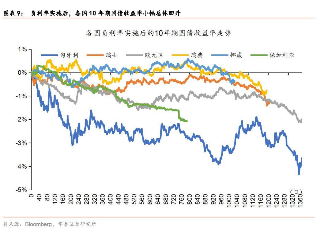 随着时间的推移,实施负利率的欧元区及其部分成员国的长端利率开始震荡下行,主因是经济复苏证伪、预期修正以及信用收缩和流动性分层导致的资产荒,债券市场出现“博傻”行情。负利率政策可以在短期对冲“欧债危机传染导致资本流入、汇率升值冲击经济”的影响,但无法扭转“欧元区经济整体下行拖累本国经济回落”,因此长端利率短期上行不可持续。同时,负利率有助于刺激经济复苏,但仅依靠货币政策没有结构性改革来打造新增长动力,无法带动经济可持续的增长,欧元区的负利率政策在对抗通缩、稳定汇率等方面有一定积极作用,但行之有效的结构性改革不多;此外,经济的整体下行压力导致信用收缩,负利率政策希望促进银行信贷投入来扩信用,但净息差收窄对银行自身的经营和盈利能力造成影响,在这种宏观环境下,希望银行提升风险偏好来寻求高收益业务是“不切实际”的。随着信用收缩与流动性分层的环境出现,市场自然偏好长期国债,特别是有稳定正收益的长期债券,负利率政策突破了名义利率零下限,伴随经济下行、债务紧缩预期下诱发的通缩预期,负利率长期债券也变得有吸引力,毕竟-1%的10年期国债收益率在-5%的通缩预期下也会有+4%的正收益。从下图不难看出,在负利率政策实施后,匈牙利、瑞士、瑞典、保加利亚、欧元区等经济体的10年期国债收益率呈现出震荡下行表现;债券市场表现出“博傻”行情。