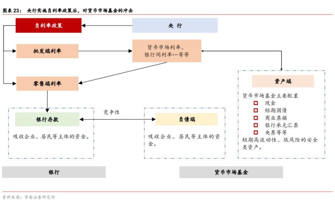 负利率政策实施后会冲击货币市场基金负债端。货币市场基金负债端的资金来源为企业和居民的闲置资金,随着互联网、移动支付等方式的发展,除了作为投资标的外,货币市场基金作为现金等价物的功能也进一步被挖掘。我们认为,负利率政策的实施对货币市场基金负债端也会带来负面影响。负利率政策实施导致广谱利率的下行,货币市场基金收益率相应走低,资产端收益率降低的压力向负债端传递,因此,货币市场基金向企业及个人等投资者可提供的收益率相应降低,投资吸引力下降。同时货币市场基金与银行存款存在一定的竞争性,虽然在移动支付、互联网金融等业态的支撑下,货币市场基金具备现金等价物的职能,但兑付能力上与银行存在较大差异,一旦出现流动性危机,银行存款还有存款保险制度的保障,货币市场基金在丧失收益优势后,在安全性、流动性等方面均难以与银行存款相比较。