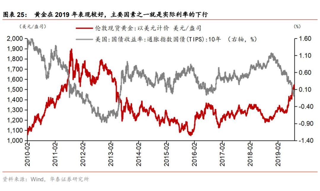 2)大宗商品持有期间收益取决于价格浮动(以贵金属-黄金为典型代表)其相对于货币市场基金等固定收益类产品的相对收益与名义利率相关。当名义利率下行时,货币市场基金收益率下行,大宗商品相对配置价值提升,可能使得其价格上涨。因此,大宗商品价格与名义利率呈负相关关系;而与通胀率呈正相关,因为通胀大幅上行、货币购买力下降时,大宗商品是相对保值的。综合来看,大宗商品价格与实际利率呈一定的负相关关系。