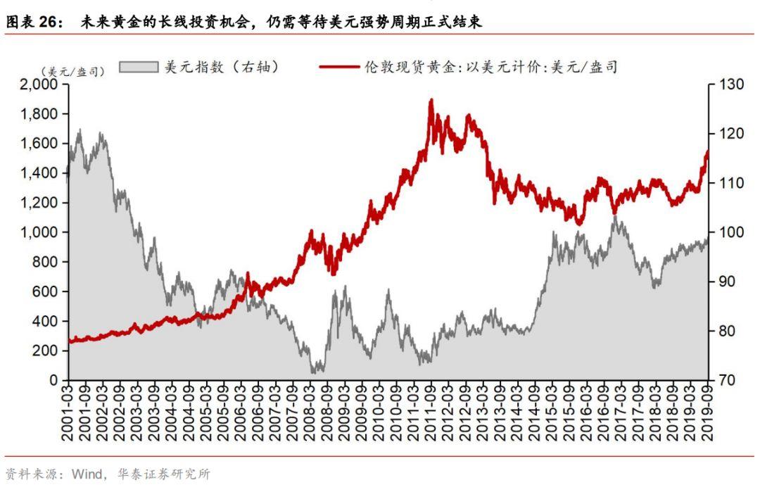 但我们认为,黄金长期趋势还是取决于美元周期。黄金与布伦特/WTI原油、铁矿石等工业原料一样,在国际市场以美元计价(最常用报价是伦敦现货金价),因而价格波动受美元指数强弱影响,美元指数处于弱周期的2004-11年间,黄金累计涨幅接近400%;随着美联储从今年下半年转入“预防式降息”,美国经济动能见顶趋弱。本轮美元强周期已接近尾声,但由于欧元区、日本等其他发达经济体目前也缺乏增长动能,在比差逻辑下美元指数尚有韧性。我们认为未来黄金的长线投资机会,仍需等待美元强势周期正式结束。