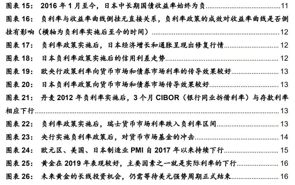 从大类资产配置视角看,负利率对各类资产价格的影响不一。负利率政策实施后,欧洲及日本权益市场受益于风险偏好提升和流动性宽松,未出现大跌反表现为高位企稳,但负利率加大了股市定价难度,导致短期波动加剧;债市表现出一定“博傻”行情,本质是赌其他投资者能接受更低的负利率水平;负利率政策一定程度上会冲击货币市场基金;大宗商品方面,负利率带动实际利率下行,短期利好包括黄金、白银等在内大宗商品,但长周期大宗商品还是取决于基本面需求的强弱,黄金、白银等贵金属的长期走势则取决于美元周期。