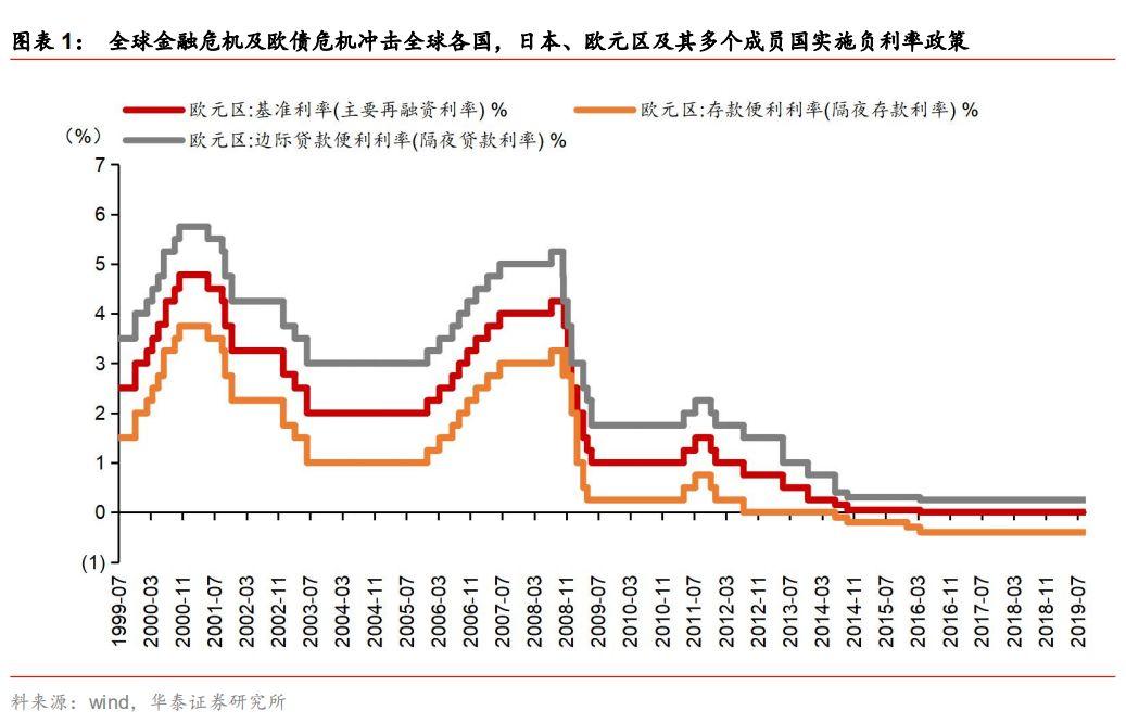 欧洲央行于2014年6月开始实施负利率政策。欧央行负利率政策主要目的是实现通胀目标,2014年6月5日,欧央行宣布了一揽子宽松政策,包括实行负利率、引入定向长期再融资操作(TLTRO)、筹备资产抵押证券(ABS)购买计划、延长固定利率全额配给主要再融资操作(MRO)至2016年底、暂停证券市场计划(SMP)购债冲销操作等措施。此次负利率政策指的是欧央行将存款便利利率由零下调10个基点至-0.1%,并适用于超额准备金利率,这意味着欧央行对银行的存款和超额准备金收费。与此同时,主要再融资利率、贷款便利利率分别下调10个基点和35个基点至0.15%和0.40%。利率走廊非对称下调,宽度由75个基点收窄至50个基点。欧央行强调,负利率针对的是银行,居民储蓄不会受到直接影响。此后欧央行继续数次下调利率,截至2019年9月3日,存款便利利率为-0.4%,贷款便利利率为0.25%,主要再融资利率为0%,欧债危机后,欧央行始终未能进入到加息通道。
