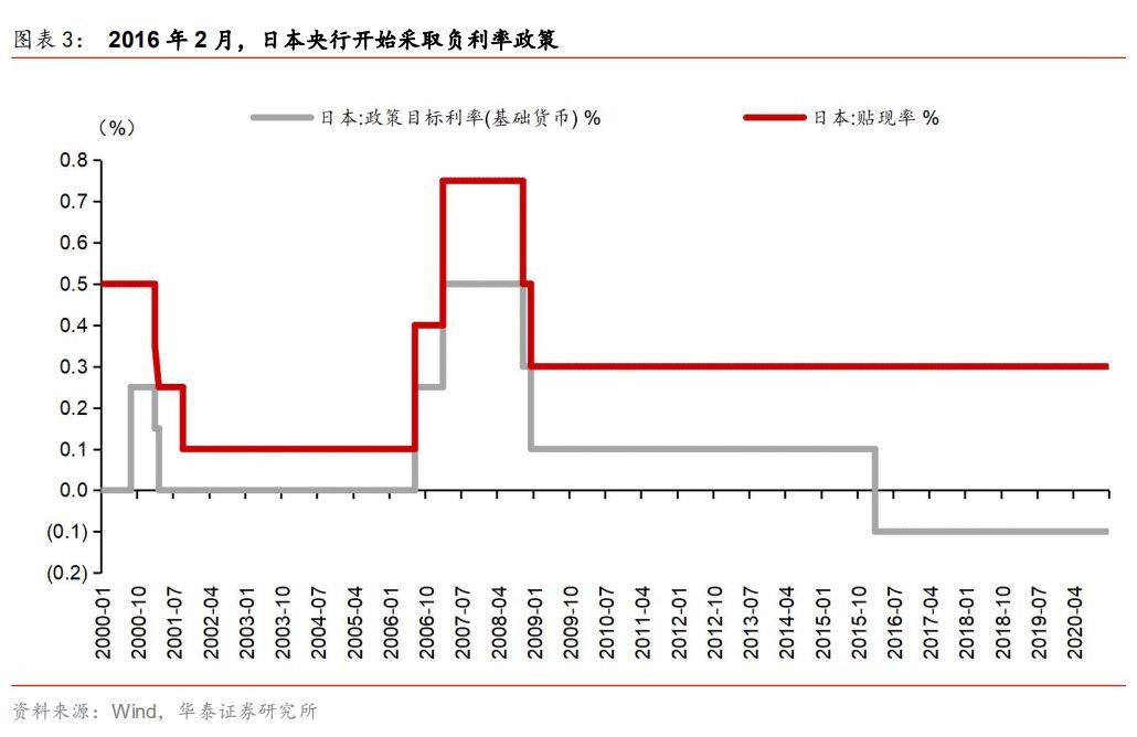 2016年2月,日央行开始实施负利率政策,对商业银行在日央行经常账户的部分存款执行负利率。具体而言,日央行对商业银行经常账户存款分为三个层级,分别实行三级利率体系:①基础余额:+0.1%利率,由过去十二个月平均超额准备金组成,可以理解为超额准备金过去的存量。②宏观加算余额(Macro Add-On Balance Rate):0%利率,由法定准备金、贷款援助基金、对地震受灾地区金融机构支持金构成;③政策利率余额:-0.1%利率,由其余新增的超额准备金组成。2016年2月,日央行将金融机构存放在央行的增量超额准备金利率从之前的0.1%降至-0.1%,以鼓励金融机构借出更多资金,如果银行不将资金贷款给企业、居民等主体而是以超额准备金形式放在央行,那么就将向日央行付利息。日本央行实行负利率政策的目标是实现每年2%左右的通货膨胀。