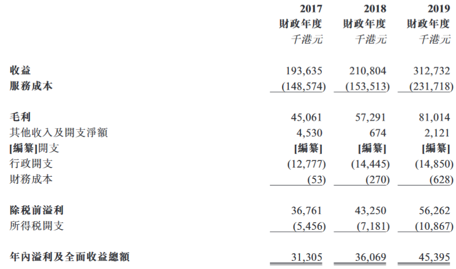 于2017财政年度、2018财政年度及2019财政年度,收益分别约为1.936亿港元、2.108亿港元及3.127亿港元。毛利分别约为45.1百万港元、57.3百万港元及81.0百万港元,而毛利率则分别约为23.3%、27.2%及25.9%。