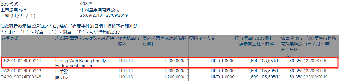 中国星集团(00326.HK)获Heung Wah Keung Family Endowment增持120万股