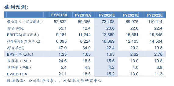 2019年9月27日,中国燃气(00384.HK)收盘价为30.10港元,我们预测公司FY2020-2022年收入分别为73,408/89,975/110,114百万港元,同比增长23.6%/22.6%/22.4%;归母净利润为10,069/12,103/14,504百万港元,同比增长22.4%/20.2%/19.8%。EPS分别为1.93/2.32/2.78港元,按最新收盘价计算对应市盈率分别为15.6X/13.0X/10.8X,我们基于2019/20财年18倍PE给予公司合理价值为34.73元/股,维持“买入”评级。