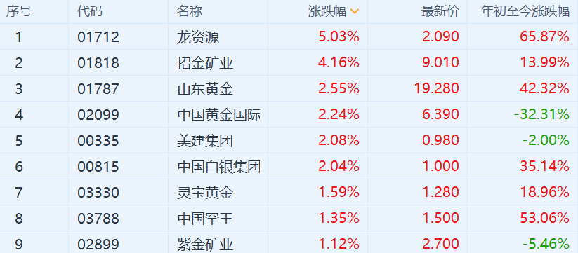 格隆汇10月25日丨港股市场黄金股逆势上涨,其中,招金矿业涨超4%,山东黄金、中国黄金国际和中国白银集团涨超2%,灵宝黄金和紫金矿业涨幅均在1%以上。