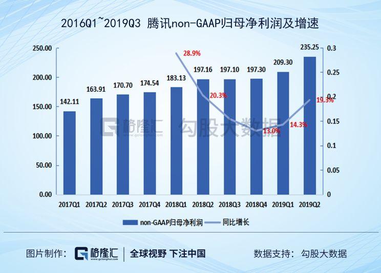 2019Q3腾讯non-GAAP归母净利润为235亿元,同比增长19%,利润增速较前几个季度继续回升,可以看到明显的触底回升。