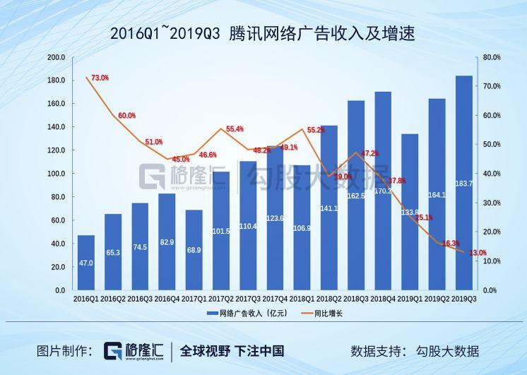 腾讯收入中占比第三大的是网络广告收入,Q3腾讯广告业务为184亿元,同比增长13%,增速较Q2继续下降。