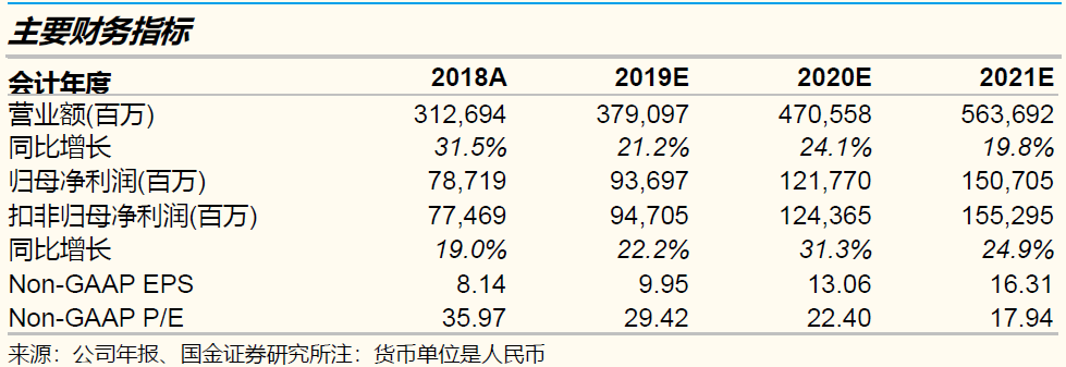 我们估计腾讯2019-21年收入CAGR 21.7%,Non-GAAP净利润CAGR 26.1%;Non-GAAP EPS分别为人民币9.95/13.06/16.31元。基于SOTP法得到目标价398.50港元。维持“买入”评级