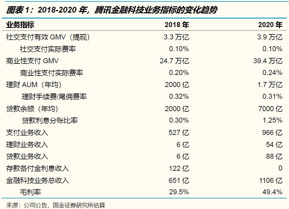 根据财报披露,微信支付的DAU、ARPU、各行业活跃商户均有增长,推动商业支付交易笔数和GMV大幅增长。我们估计,理财(主要是理财通)、贷款(主要是微粒贷)的收入规模同比也有大幅增长。与此同时,各项金融业务的收入费率稳中有升,成本费率则稳中有降。我们估计,到2020年,金融科技业务有望贡献1106亿收入、546亿毛利。