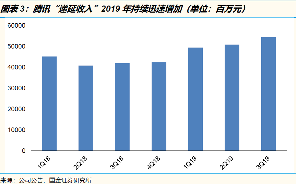 2019Q3,腾讯手游收入同比增长25%、端游收入同比下滑7%,均略低于我们的预期。但是,资产负债表为我们提供了更多信息——“递延收入”(主要体现已充值而未消费的游戏流水)同比大幅上升,目前处于历史最高点。我们认为,这提现了《和平精英》商业化大获成功、《王者荣耀》《英雄联盟》流水继续增长,以上三款游戏的摊销周期明显较长。此外,2019年8-9月,腾讯放慢了手游新品上线节奏,显然是为未来做储备。
