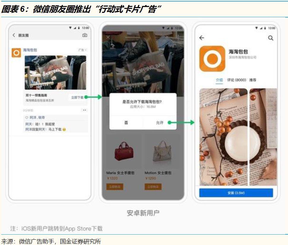 现阶段,腾讯广告业务的焦点是推出更灵活的广告形式、提高转化率。例如,朋友圈广告在2018年以前一直以高端品牌为主,2019年7月开始允许小程序直接投放到朋友圈,11月又推出了“行动式卡片广告”——鼓励用户直接点击跳转到小程序或下载App。10月底,腾讯还推出了“附近推”营销解决方案,允许中小商户向3公里内的潜在消费者投放朋友圈广告。一言以蔽之:朋友圈广告越来越从“品牌”转向“效果”。