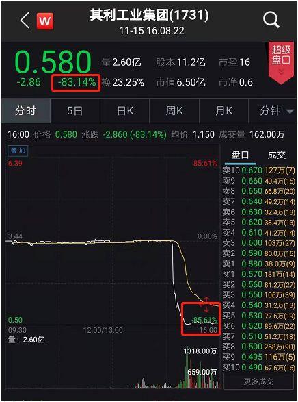 又有一只港股闪崩了!11月15日,港股上市公司其利工业集团出现了断崖式暴跌,临近下午三点,原本走势相对稳定的股价,突然跳转急下,短短25分钟就狂跌85%,刷新最低价格0.470港元。截至当日港股收盘,其利工业集团报收0.580港元,跌幅仍然高达83.14%。仅一个交易日,上市公司市值蒸发了32亿港元。