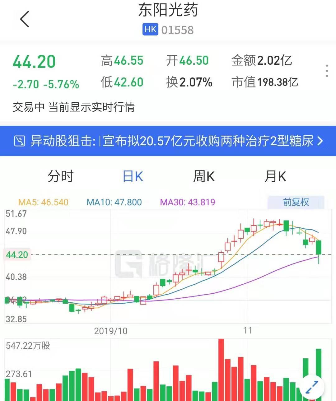 格隆汇11月18日丨流感概念股东阳光药(1558.HK)近日持续回落,盘中一度跌9.17%至42.6港元,现报44.2港元,跌5.76%,暂成交2.02亿港元,最新总市值198.38亿港元。