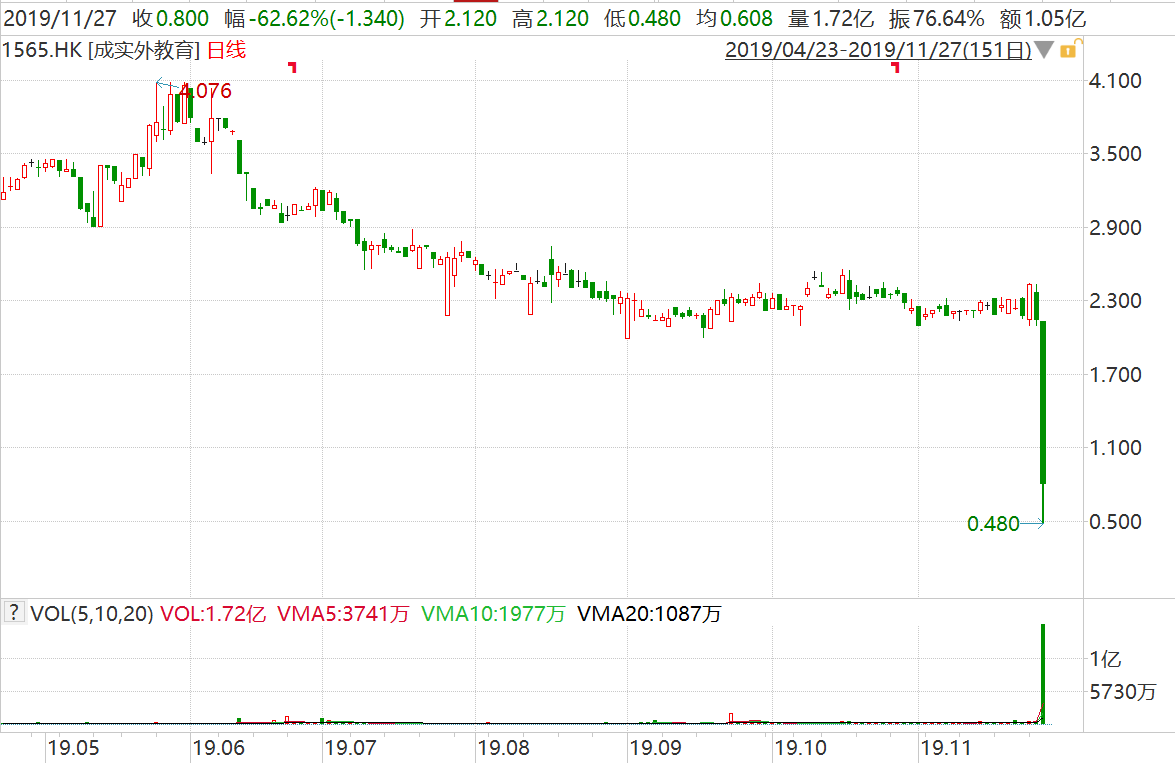 首控集团(1269.HK)为港股通标的,市值由昨天的91亿港元一度缩水至盘中的20亿港元。成实外教育(1565.HK)市值一度由66亿缩水至盘中的15亿。此外,成实外教育暴跌后,另一只教育股新东方在线(1797.HK)也一度快速下跌近8%。