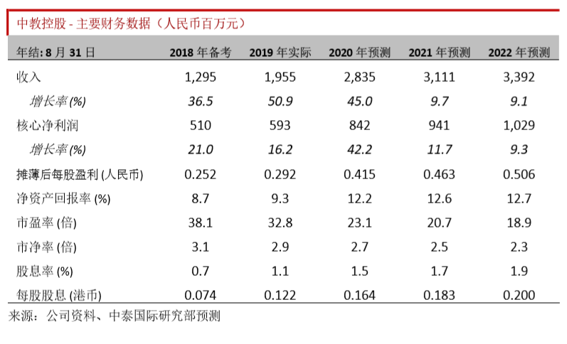 截止 8 月底,中教控股在校总人数超过 17 万人。2019 年公司收入同比增长 50.9%,人民 币19.6 亿元;受到新学校毛利率较低的影响,期内整体毛利率57.4%,同比下滑3.2 个百 分点;期内利息开支从人民币 3000 万大幅增加至人民币 1.04 亿元(其中包括 4000 万非 现金项目的递延利息);报告净利润人民币 5.9 亿,同比增长 16.2%。剔除利润表上的非 现金项目人民币1.5亿(包括汇兑亏损、以股份为基础付款、递延推算利息、可换股债劵 公允值收益等),公司期内核心净利润为人民币 7.5 亿元,同比增加 17.4%。