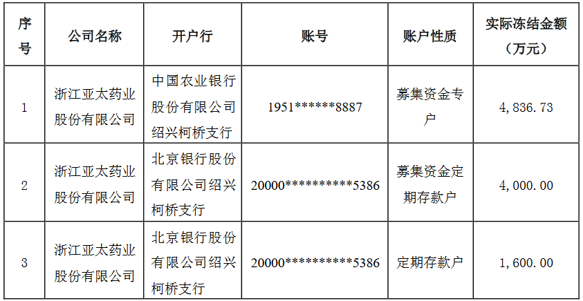 亚太药业(002370.SZ)共有三个银行账户被冻结 合计冻结金额1.04亿元