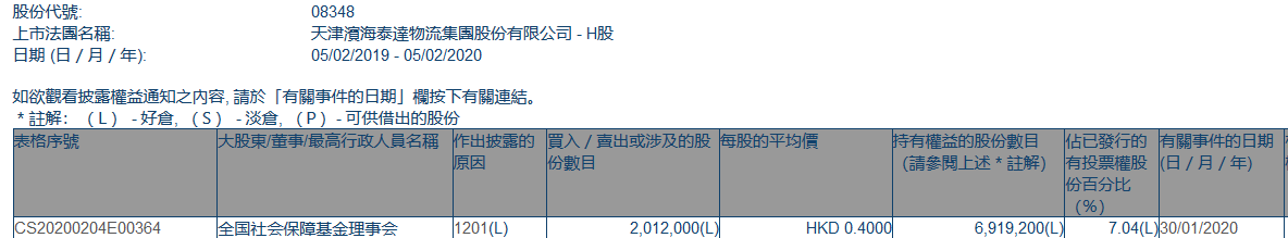 滨海泰达物流(08348.HK)遭全国社保基金理事会减持201万股