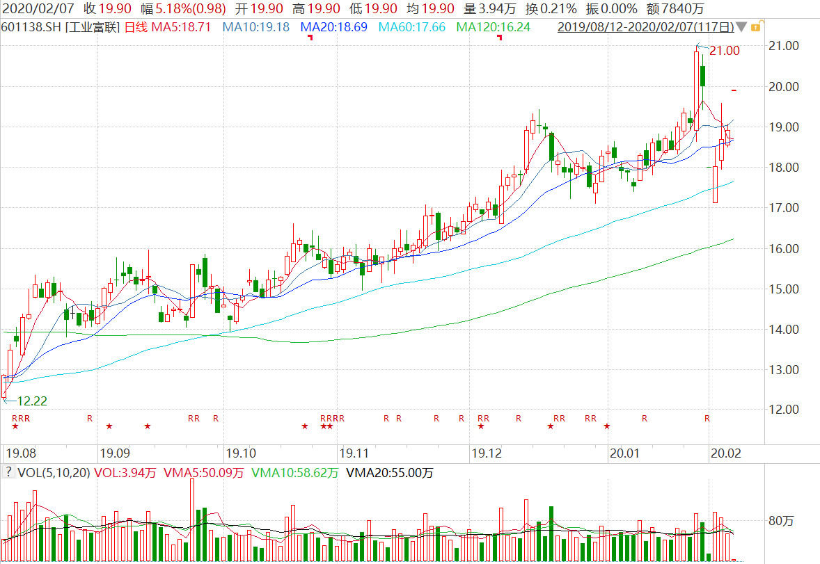 格隆汇2月7日丨工业富联(601138.SH)开盘上涨5.18%,报19.9元,成交7840万元,最新总市值为3951亿元。