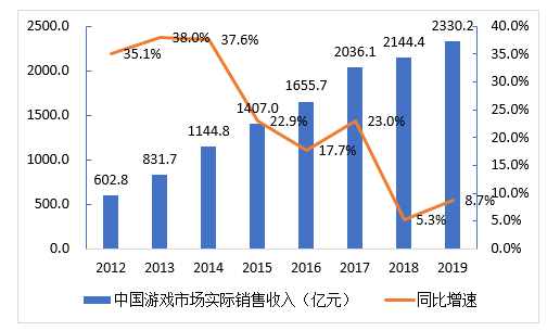 图:2012~2019年中国游戏市场规模(亿元)               来源:伽马数据