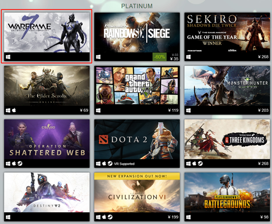 事后证明,乐游的这个战略非常精准,2017~2019年,《Warframe》连续三年进入Steam铂金级畅销游戏(最畅销的十二款游戏)榜单,也使得《Warframe》成为唯一一款并非由Valve (Steam)开发的获此殊荣的免费网游。