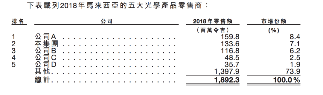 每一个即将上市的公司都会在招股书里给自己一个响亮的名号,MOG用的是“第二大光学产品零售商”,我们来看看在马来西亚的光学产品零售商份额——前三名分别为8.4%、7.1%、6.2%,MOG作为第二名的规模优势并不明显,其2018年全年销售额为1.60亿令吉,约合人民币2.64亿元。