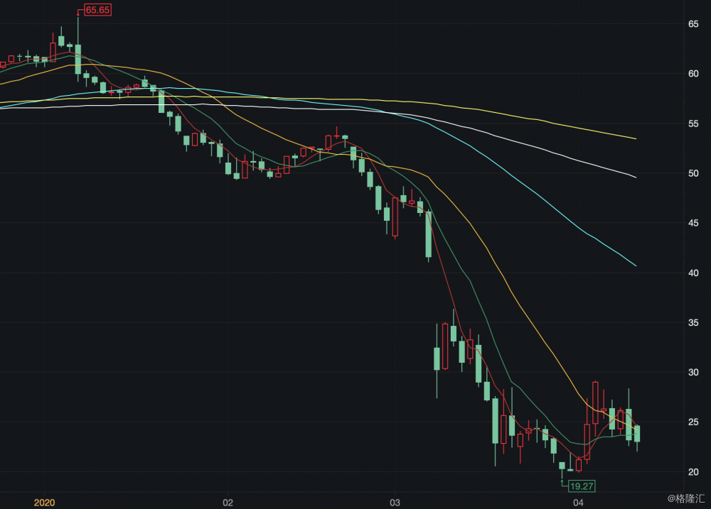 受疫情的影响,世界石油需求大幅下降,加上3月初沙特和俄罗斯为了市场份额相继增产。需求的下降,供给的增加,导致了油价崩盘式的下跌,NYMEX原油从最高的65元下跌到最低的19元。